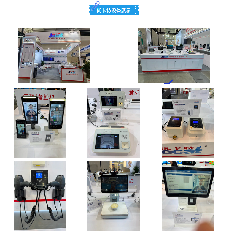 展會期間,深圳優卡特全面展示了核心產品矩陣,覆蓋多元智慧場景需求。從保障出入口安全的訪客機、門禁 / 考勤機,到優化園區消費體驗的食堂消費機、安卓人臉消費機,再到 AI 賦能的POS 款安卓人臉消費機(AI 視覺結算) ,每款產品都展現了前沿的技術實力。同時,現場還呈現了水控機、水電控系列、掌靜脈系列等高效管理設備,以及智能共享吹風機、智能電控機等創新產品,全方位覆蓋智慧園區、校園、企業等多領域的一卡通應用需求。